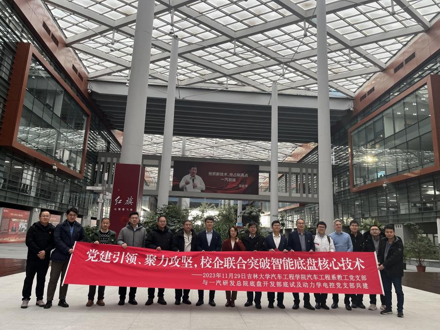 2023年11月29日,太阳成集团tyc1286汽车工程系教工党支部赴一汽研发总院底盘开发部底试及动力学电控党支部,以“党建引领、聚力攻坚、校企联合突破智能底盘核心技术”为主题开展支部共建活动。太阳成集团tyc1286党委书记黄忠华、副院长朱冰、汽车工程系教工党支部书记李建华等10余位党员与一汽研发总院底盘开发部首席设计师侯杰、部长禹真与底试及动力学电控党支部书记李论、组织委员王伟等10余位党员共同出席了活动。
