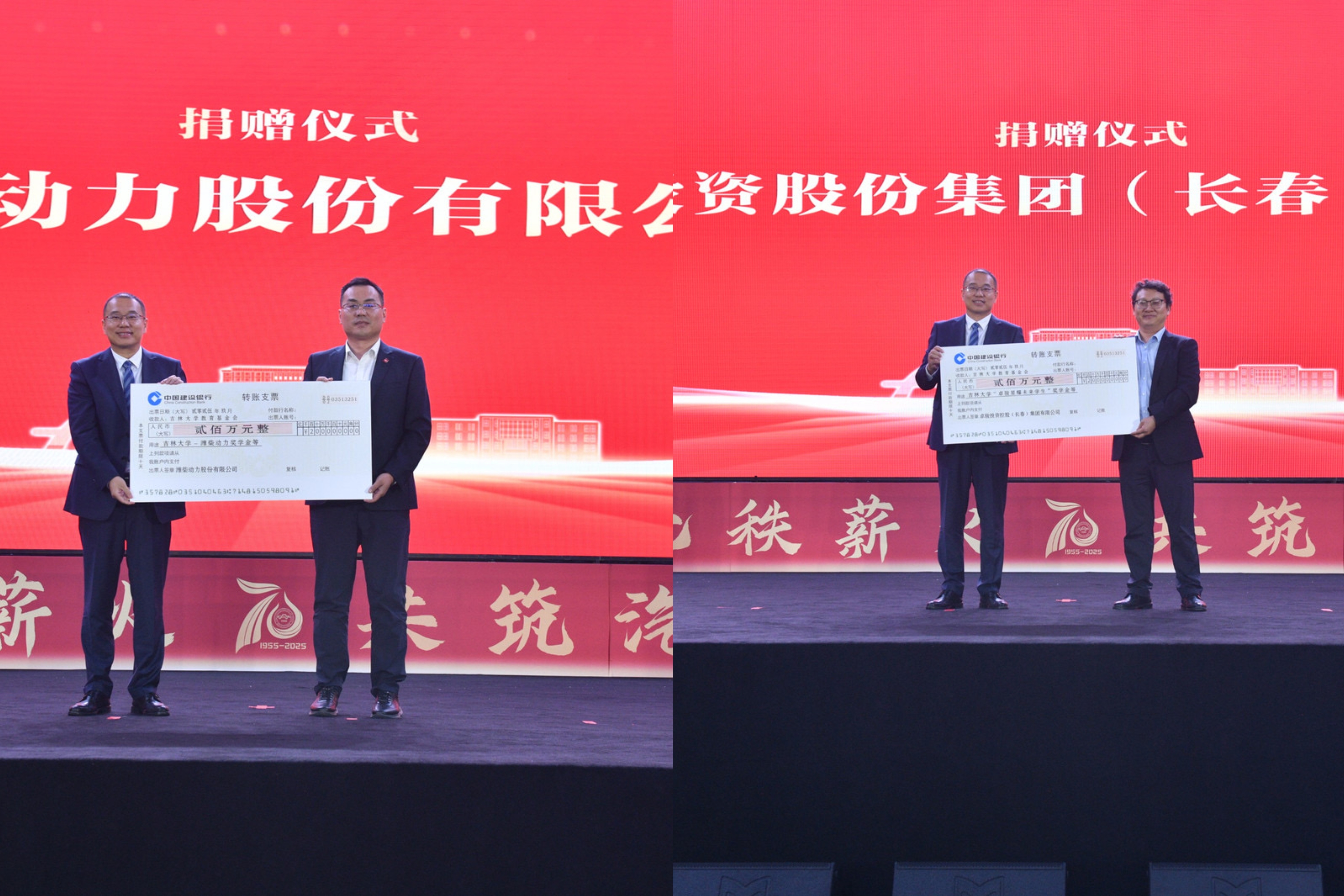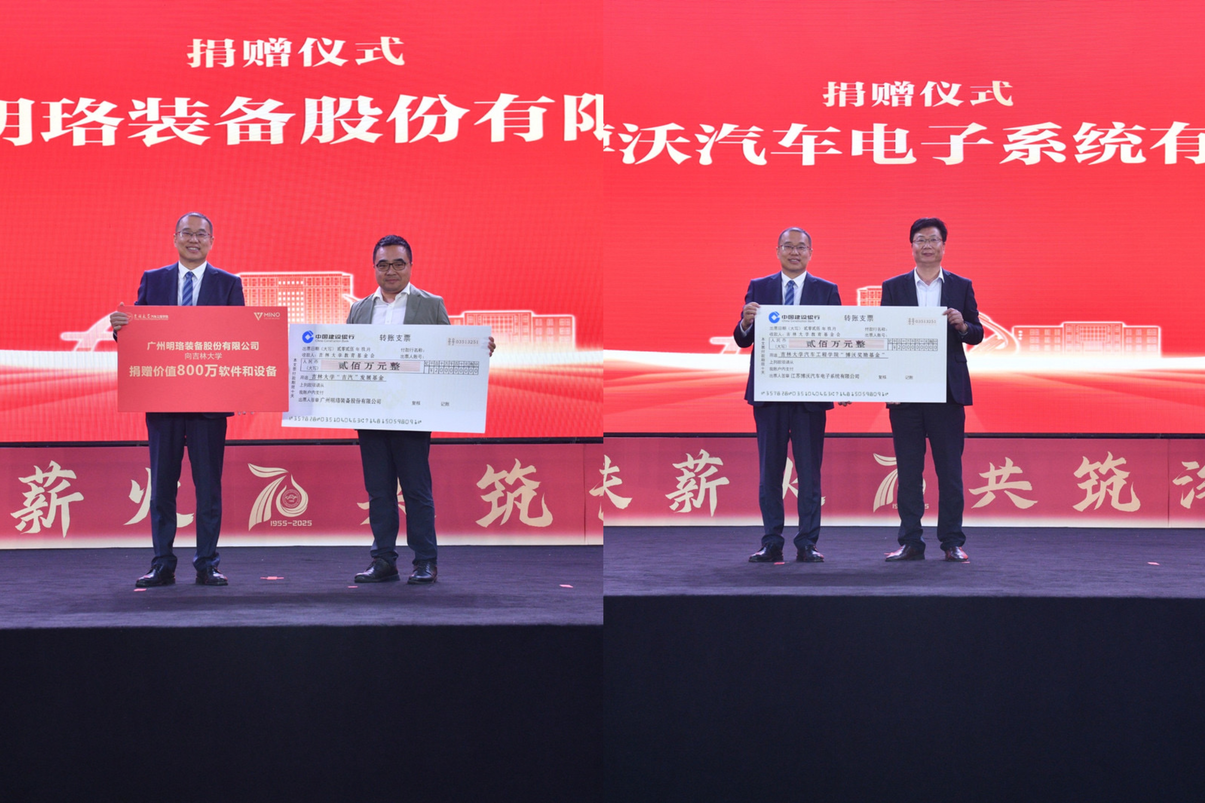 捐赠仪式上,潍柴动力股份有限公司、卓骏投资股份集团(长春)有限公司、江苏博沃汽车电子系统有限公司、广州明珞装备股份有限公司等4家单位向学院捐赠现金共计800万,以及800万设备和软件。