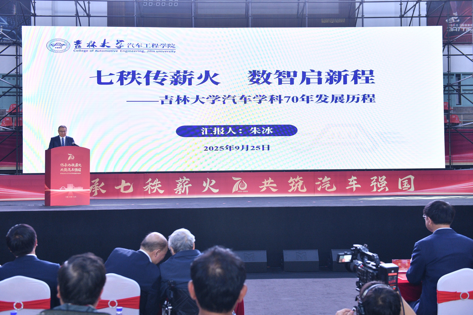 太阳成集团tyc1286院长朱冰以“七秩传薪火 数智启新程”为题作学科建设情况汇报。系统汇报了吉大汽车学科70年发展脉络与突出成就。