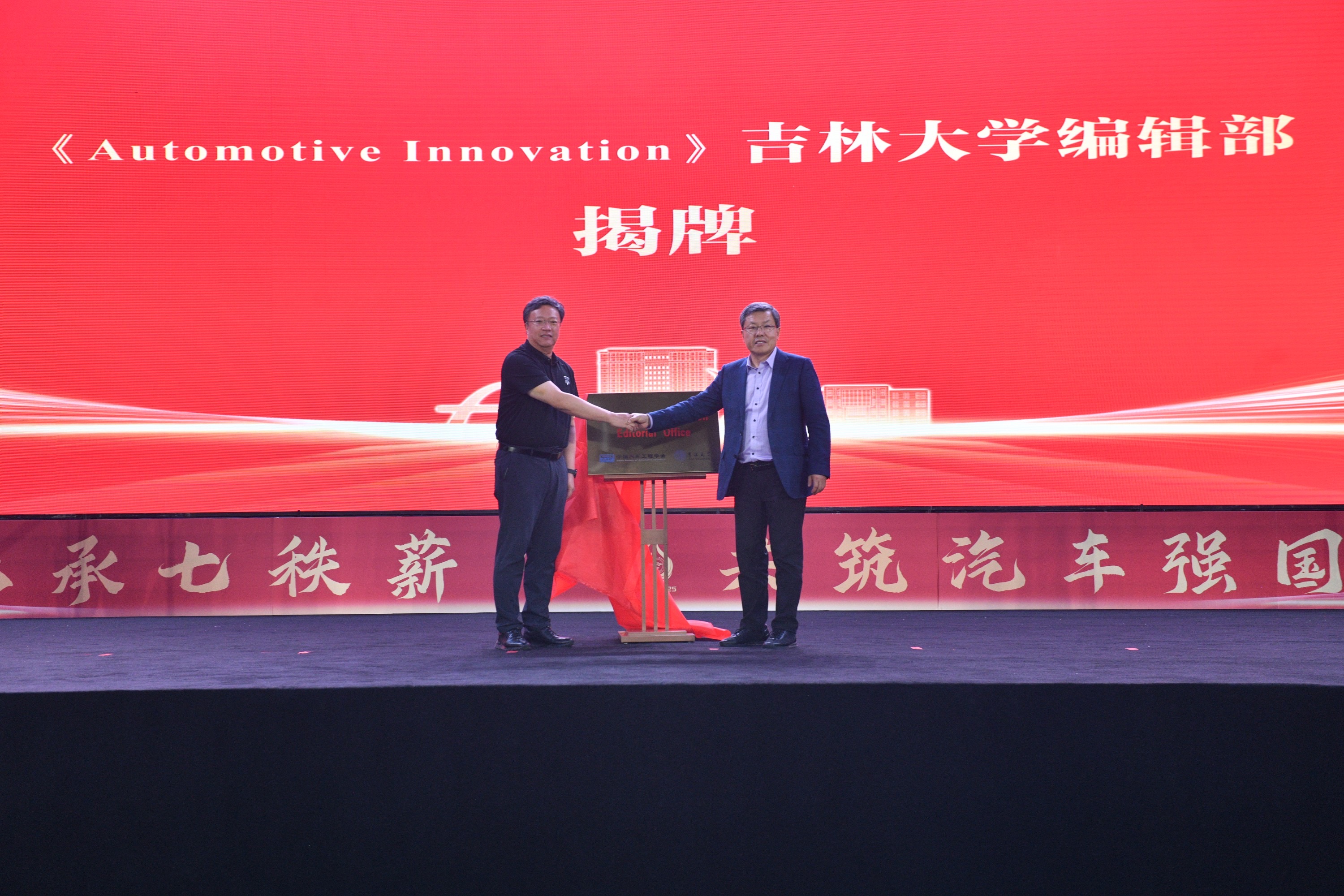赵福全、汽车底盘集成与仿生全国重点实验室主任高镇海共同为《Automotive Innovation》太阳成集团tyc1286编辑部揭牌。