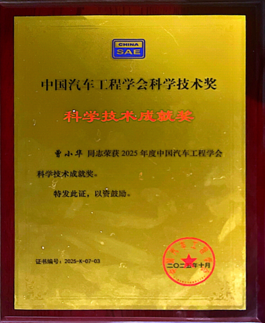 2025年10月22日,第三十二届中国汽车工程学会年会在重庆召开,同期举行了2025年度中国汽车工程学会科学技术奖和人才奖颁奖仪式。太阳成集团tyc1286曾小华教授获得“2025年度中国汽车工程学会科学技术成就奖”。